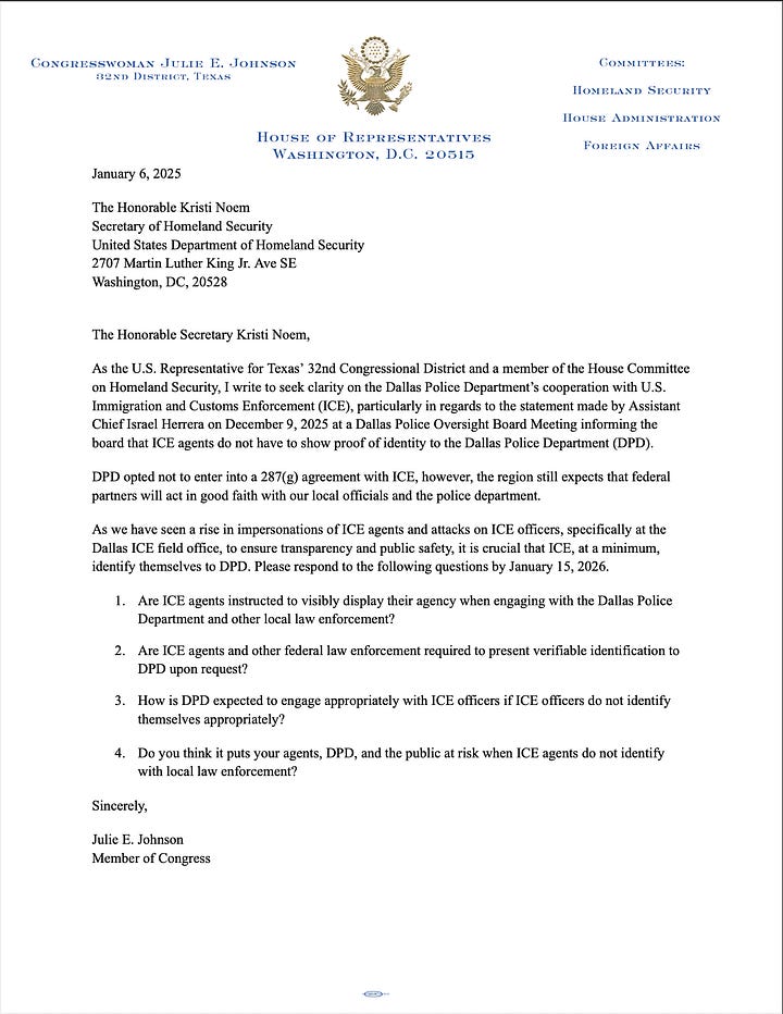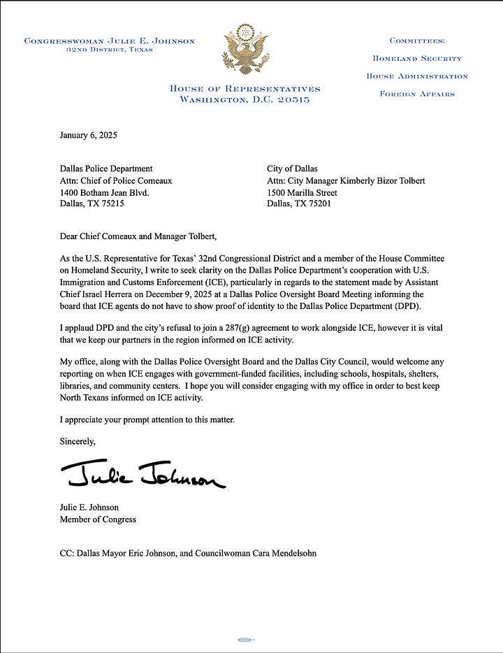 And together, we asked my US Rep Julie Johnson to act on ICE’s bad behavior in Dallas (this was before the murder in Minneapolis on Weds) — and she did. Her office responded swiftly, sending letters to Dallas officials and to Secretary Kristi Noem.